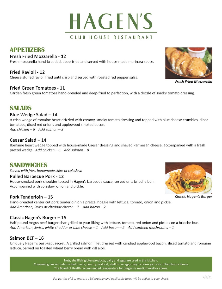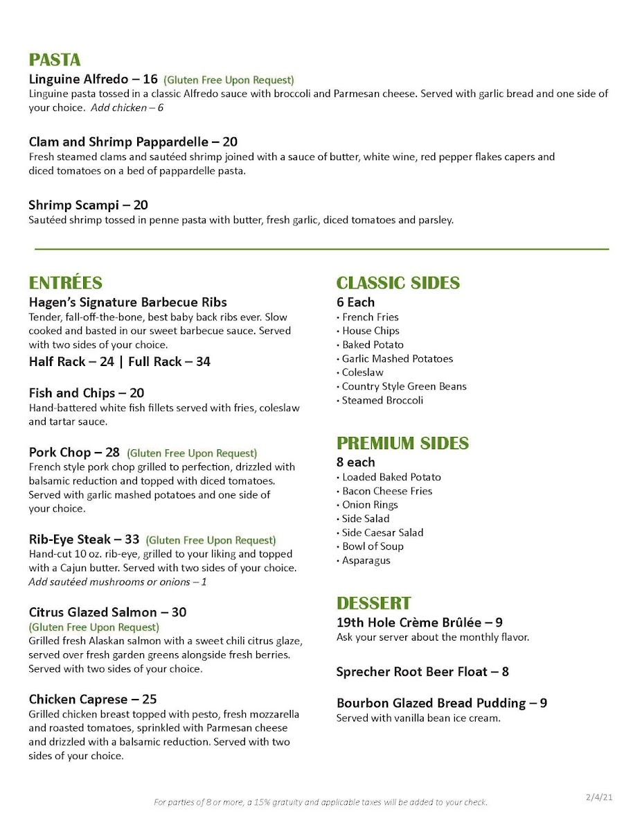 Located in the picturesque setting of French Lick, Indiana, Hagen's Club House Restaurant offers a delightful culinary experience. Known for its vibrant atmosphere, this restaurant excels in classic dishes like their famous Salmon BLT and diverse pasta offerings, including Linguine Alfredo and Clam and Shrimp Pappardelle. Guests enjoy stunning views while savoring expertly crafted cocktails such as the Signature Bloody Mary and refreshing mimosas. With attentive service that complements the relaxed vibe, Hagen's promises a memorable dining experience, making it a perfect spot for families or golfers looking to unwind after a round. Reservations are recommended, as it fills quickly!